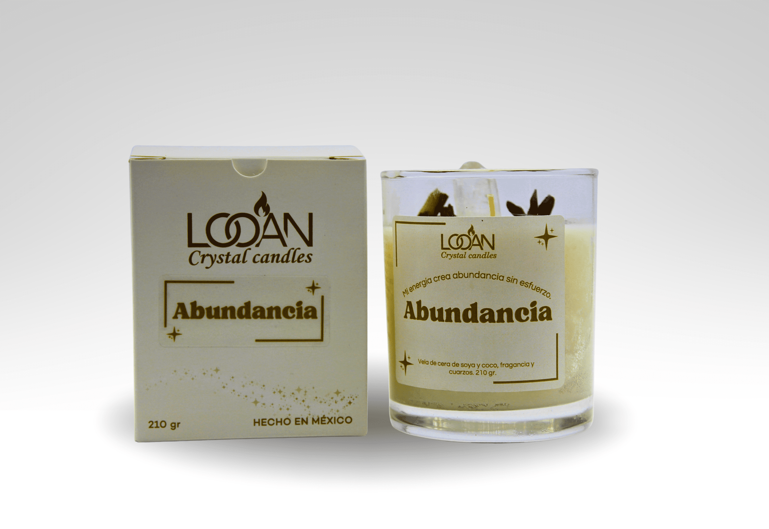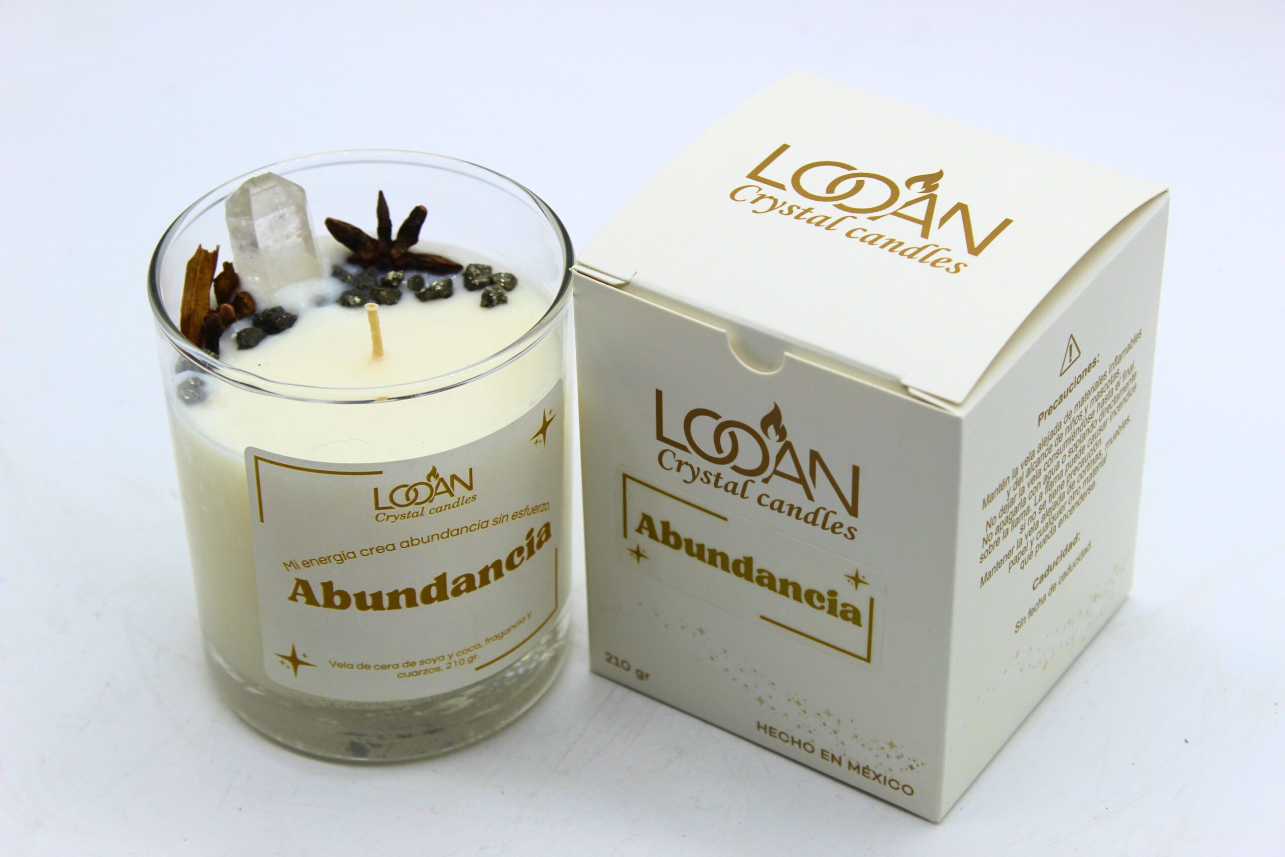Vela Crystal Candle Abundancia — Canela, Pirita y Cuarzo Blanco