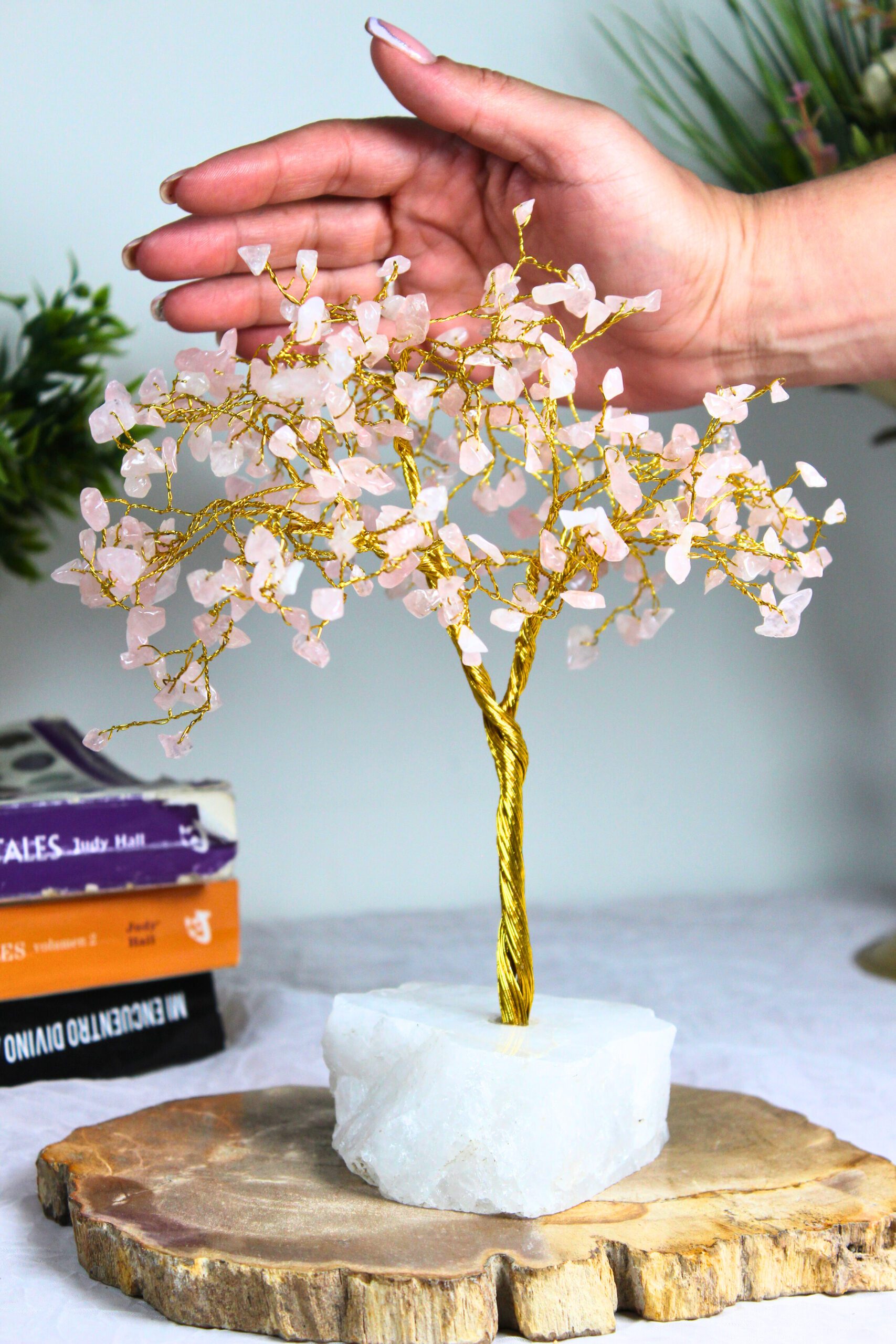 Dale amor y armonía a tu espacio con este hermoso Árbol de la Vida elaborado a mano con piedras naturales de Cuarzo Rosa.