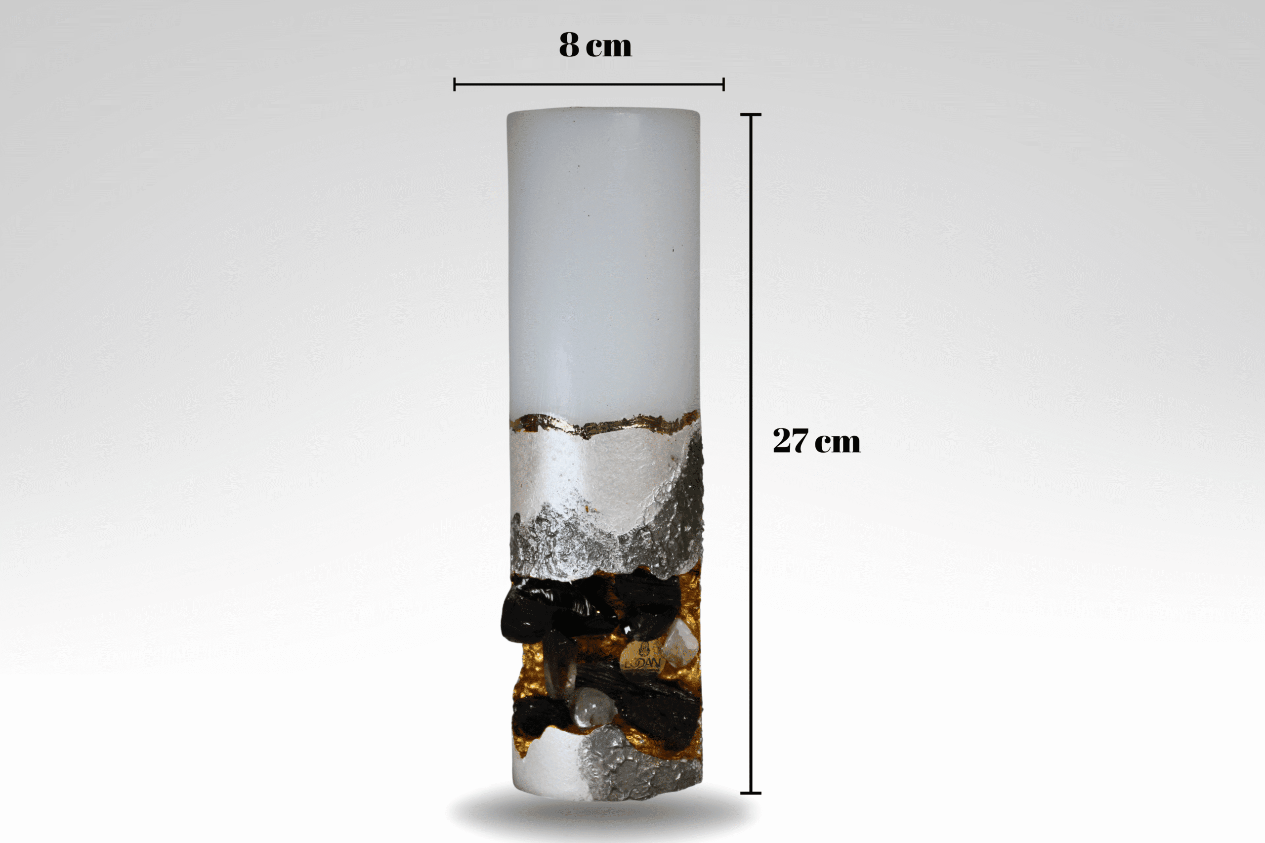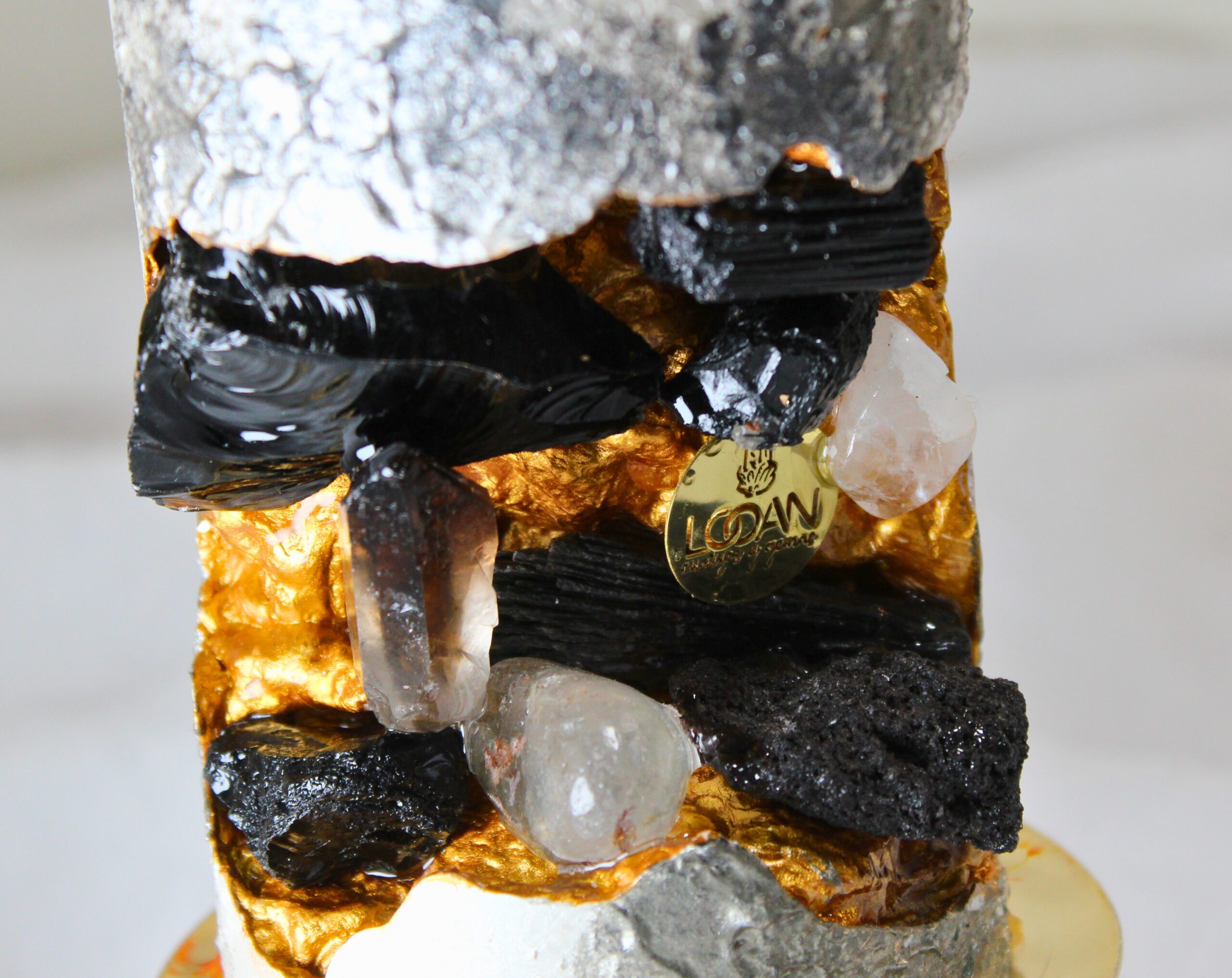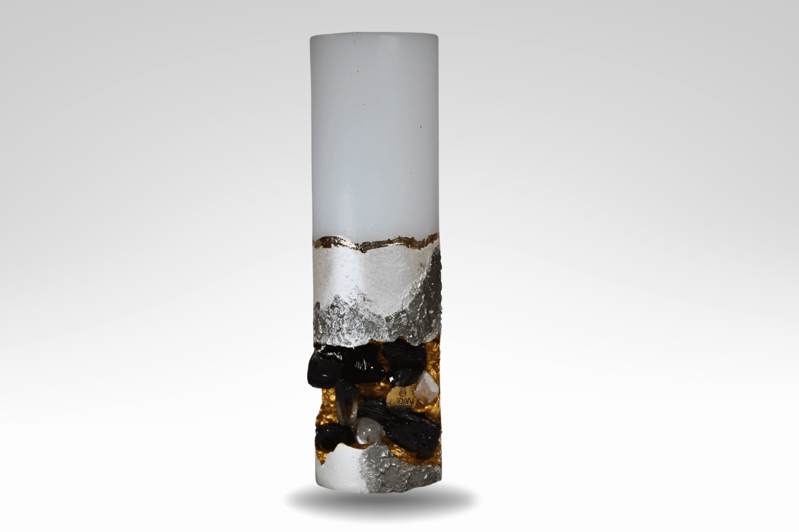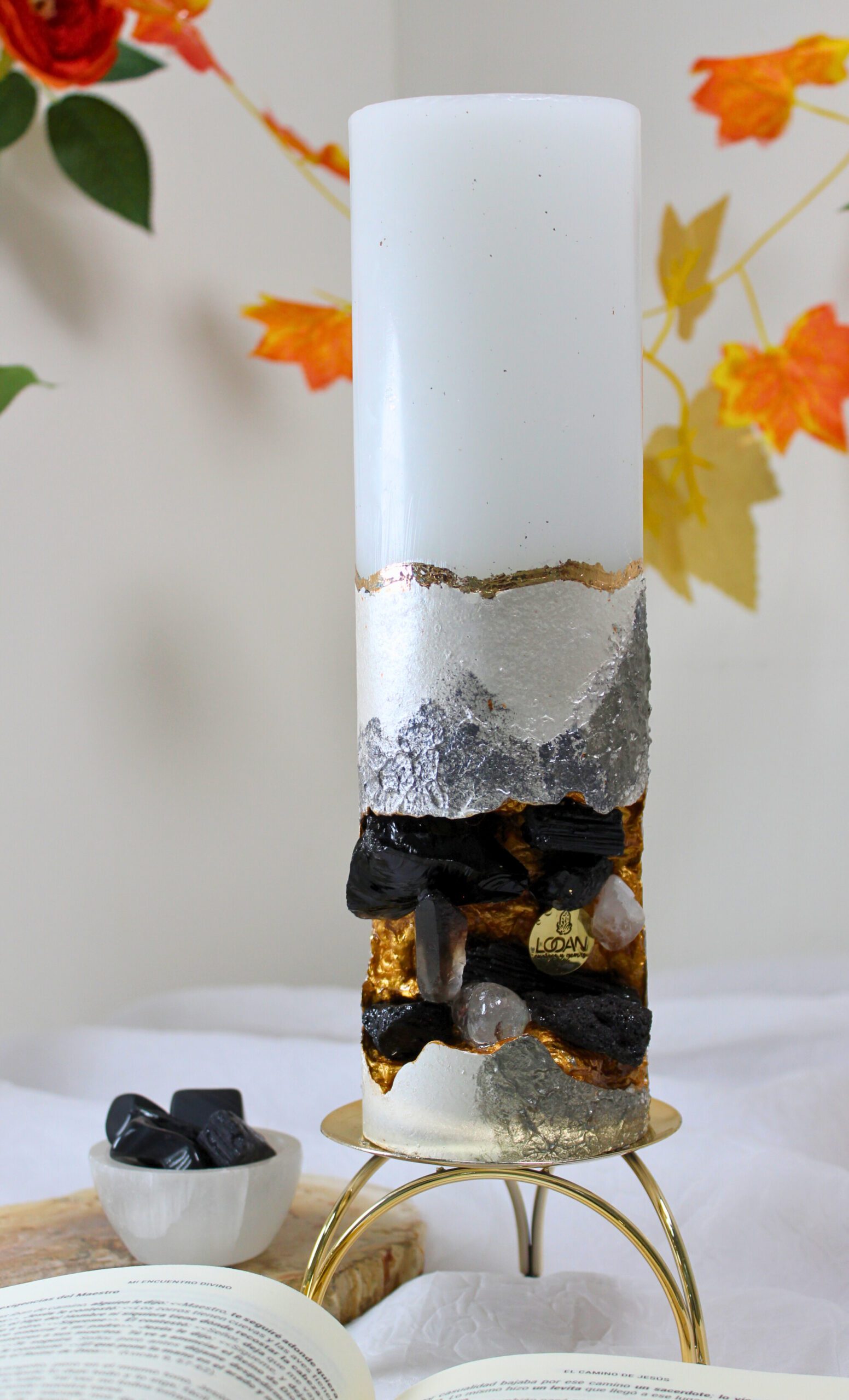 Crea un campo de fuerza a tu alrededor con nuestro Velón Energético de Protección, elaborado artesanalmente con turmalina negra y obsidiana, dos de los minerales más poderosos para bloquear y transmutar energías densas.